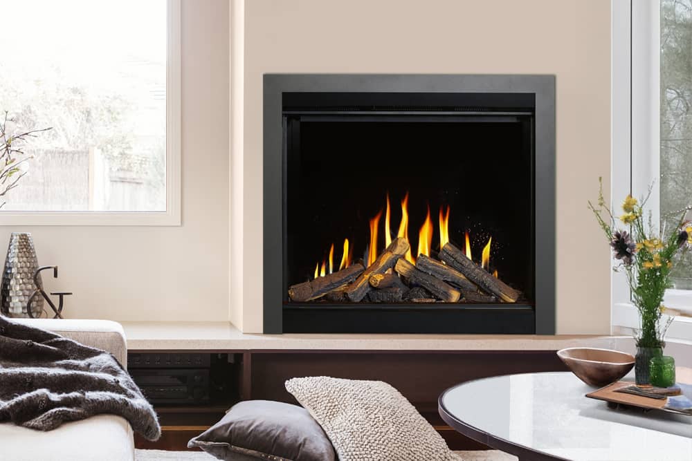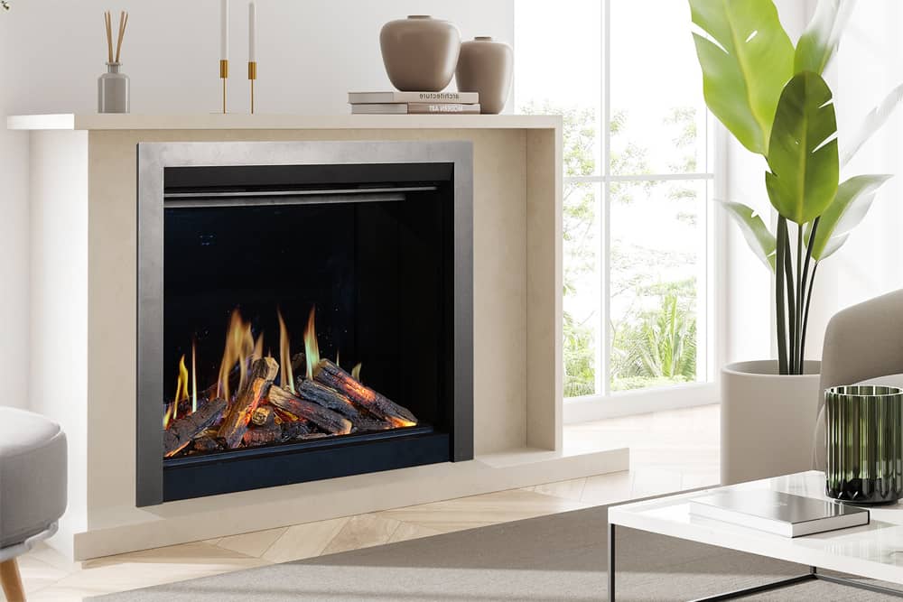 The HE6 electric fireplace provides an uninterrupted view of the realistic logs and fire.